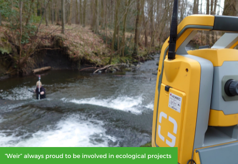 But in order to conduct this work effectively and efficiently a detailed survey of the river both 50m upstream and 50m downstream of the weir, 0.6m of the banks on both sides and 10m from the bank into the adjacent forest was required much to the delight of the Gridmark Survey team who are always enthused to be involved in ecological project work.